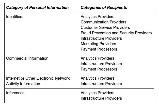 In the preceding 12 months, we have collected the following categories of personal information: identifiers, commercial information, internet or other electronic network activity information, and inferences. For details about the precise data points we collect and the categories of sources of such collection, please see the Collection of Information section above. We collect personal information for the business and commercial purposes described in the Use of Information section above. In the preceding 12 months, we have disclosed the following categories of personal information for business purposes to the following categories of recipients: